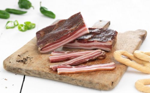 La pancetta, delicatamente venata di grasso, affumicata su legno di faggio, asciugata all’aria e stagionata per settimane garantisce piatti gustosi in cucina.