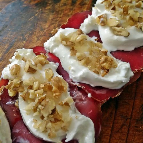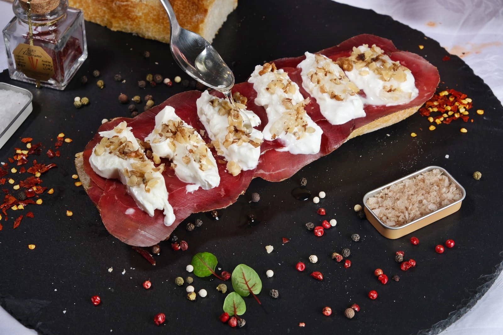 Bresaola ( prosciutto crud-uscat vaca) , burrata/ricotta ( la alegere) (lapte BIVOLITA ) , NUCI, miere.